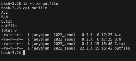 - ls -l >> outfile