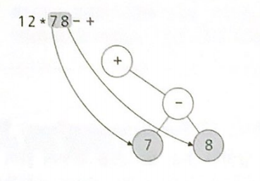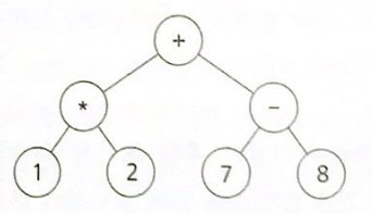 '+' 연산자는 왼쪽 하위 트리가 표현하고 있는 수식 (1*2)와 오른쪽 하위 트리가 표현하고 있는 수식 (7-8)을 피연산자로 삼고 있다. 따라서 이 수식 트리는 루트 노드를 중심으로 왼쪽 하위 수식 트리의 결과 값과 오른쪽 하위 수식 트리의 결과 값을 피연산자로 하는 계산을 수행하면 전체 수식의 계산 결과를 얻을 수 있다.