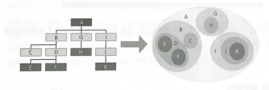 :트리는 하위 트리의 집합이라고 할 수 있다. 하위 트리 역시 또 다른 하위 트리의 집합이라고 할 수 있다. 이러한 정의는 하위 트리가 또 다른 하위 트리로 나뉘어질 수 없을 때까지, 즉 하위 트리가 잎 노드일 때까지 반복해서 계속된다.