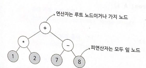 1, 2, 7, 8은 모두 잎 노드이다. 반면에 연산자들은 모두 루트 노드이거나 가지 노드인 것을 알 수 있다.