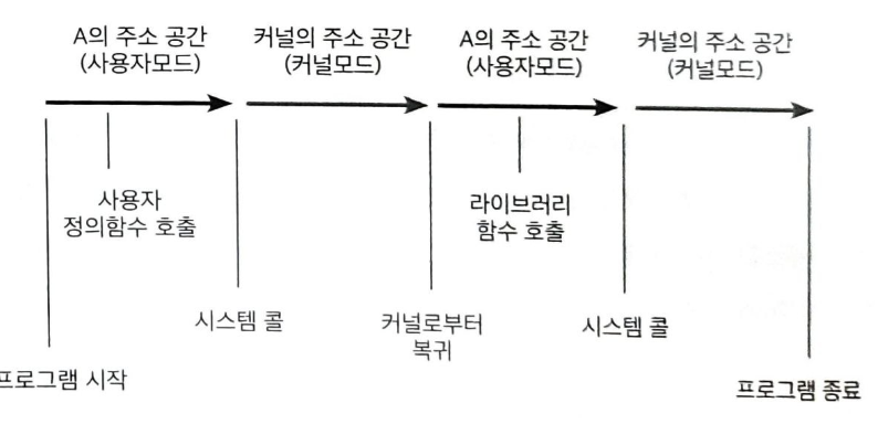시스템 콜 → 커널 모드로 진입 커널의 주소 공간에 정의된 함수를 실행. 끝나면 다시 사용자모드로 복귀해서 시스템 콜 이후의 명령들을 계속 실행. 프로그램의 실행이 끝날 때에는 커널 모드로 진입해 프로그램 종료.