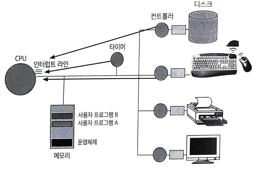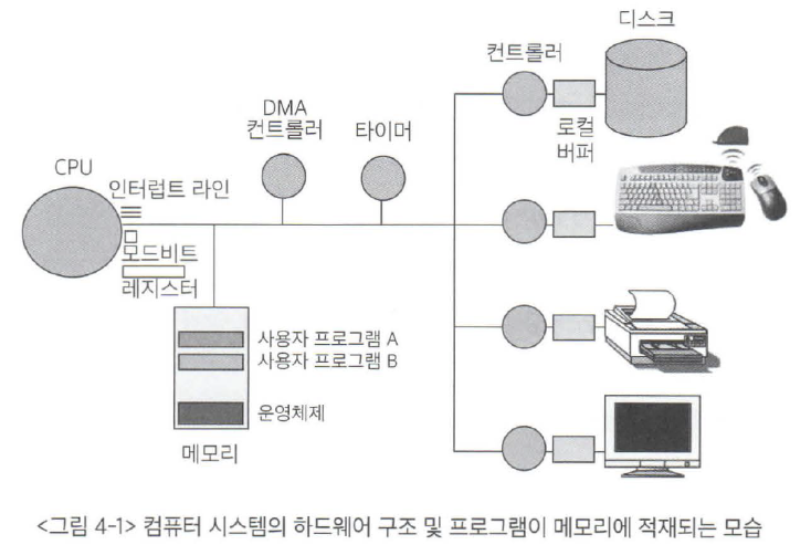- 메모리 위에 사용자 프로그램과 운영체제가 같이 올라가 수행됨.