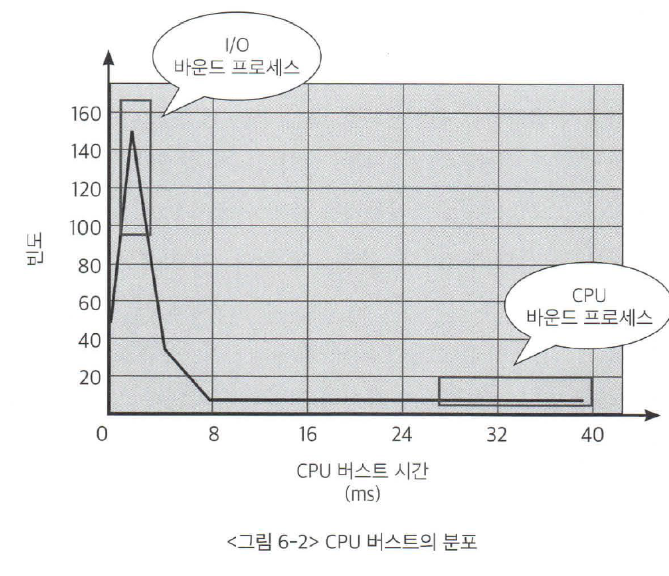 프로그램이 수행되는 구조를 보면 I/O 바운드 프로세스는 짧은 CPU 버스트를 많이 가지고 있는 반면, CPU 바운드 프로세스는 소수의 긴 CPU 버스트로 구성됨.