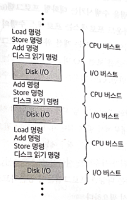 - 사용자 프로그램이 CPU를 직접 가지고 빠른 명령을 수행하는 일련의 단계 == CPU 버스트(burst)