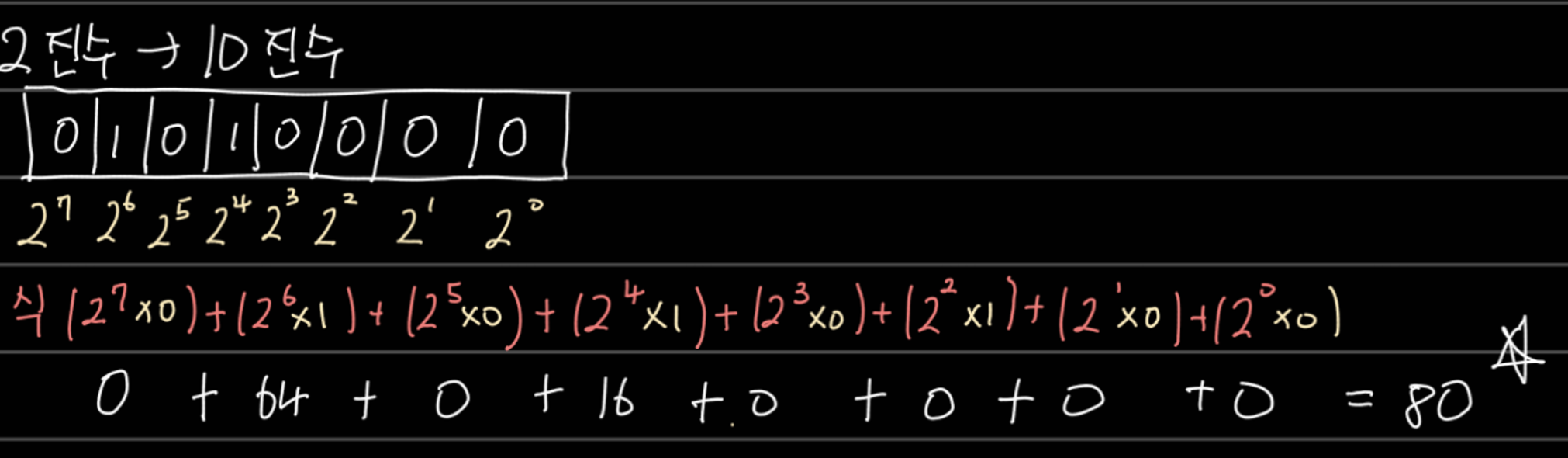 → 위에서 80을 2진법으로 나타낸 결과값으로 다시 10진법으로 나타내보자