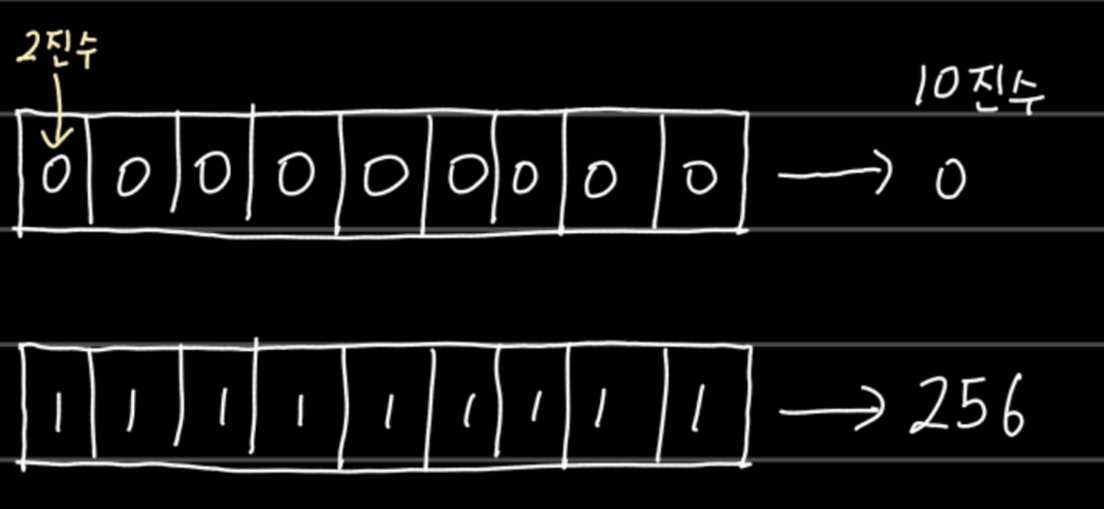 - 8비트가 모두 0이면 10진수는 0이고, 모두 켜지면 256이 된다.