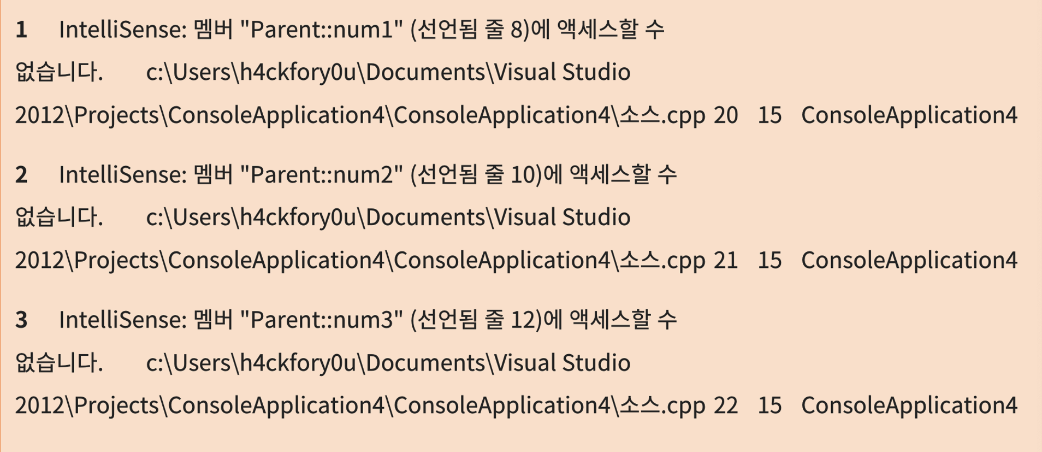 public상속.cpp:20:15: error: 'num1' is a private member of 'Parent'