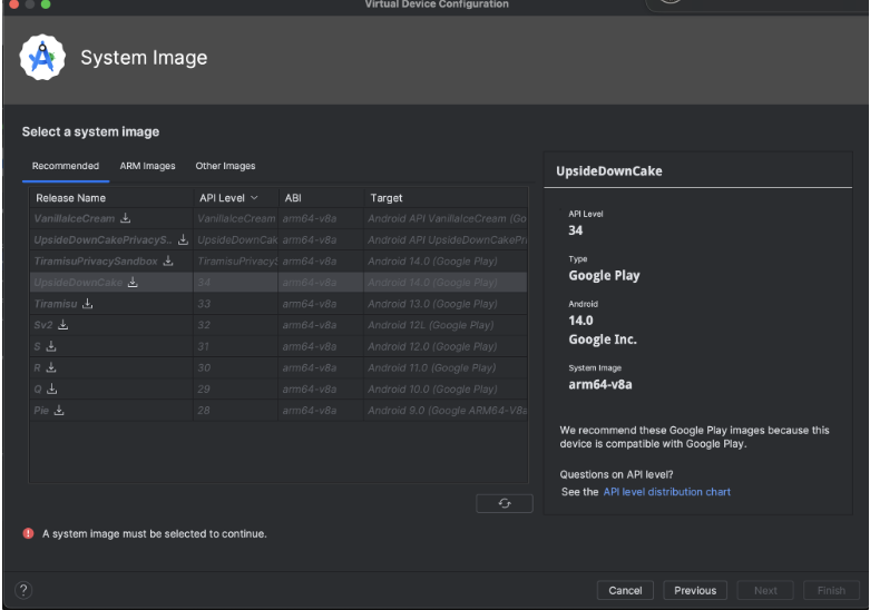 - UpsideDownCake 선택 → next 클릭