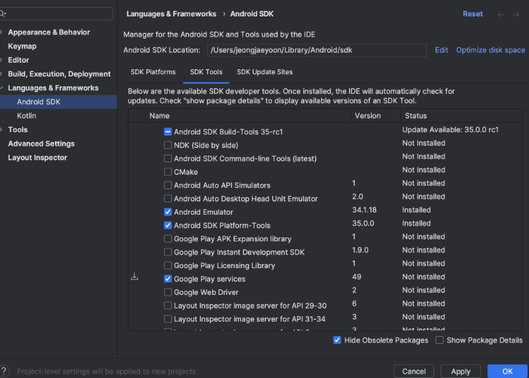 - SDK Tools → Google Play Services 추가