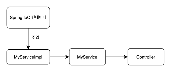 - MyServiceImpI을 직접 new로 생성해서 MyService에 저장