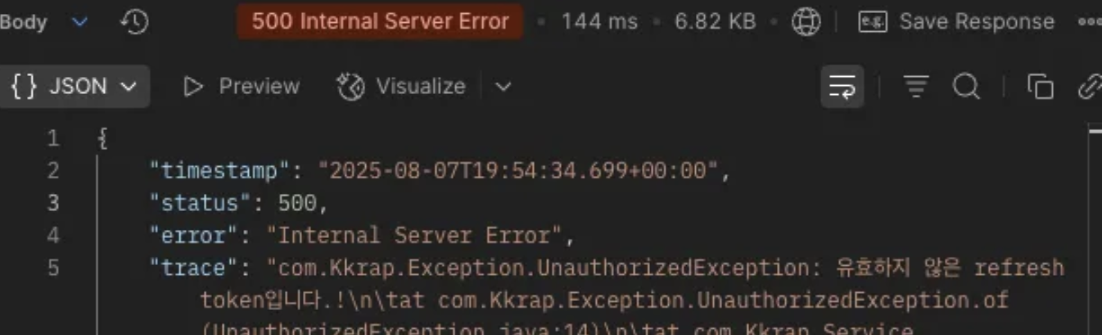 - Accesstoken 만료검사를 위해 만료된 accesstoken을 서버에 날려서 내가 만든 Error Handler가 잘 동작하는지 보기 위해서 Postman으로 던져보았다.