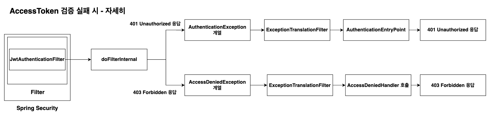 Accesstoken을 AuthenticatipnException 계열 예외를 던지도록 바꾸고 실패 시 응답은 AuthenticationEntryPoint에서 처리하는 방식으로 하자.