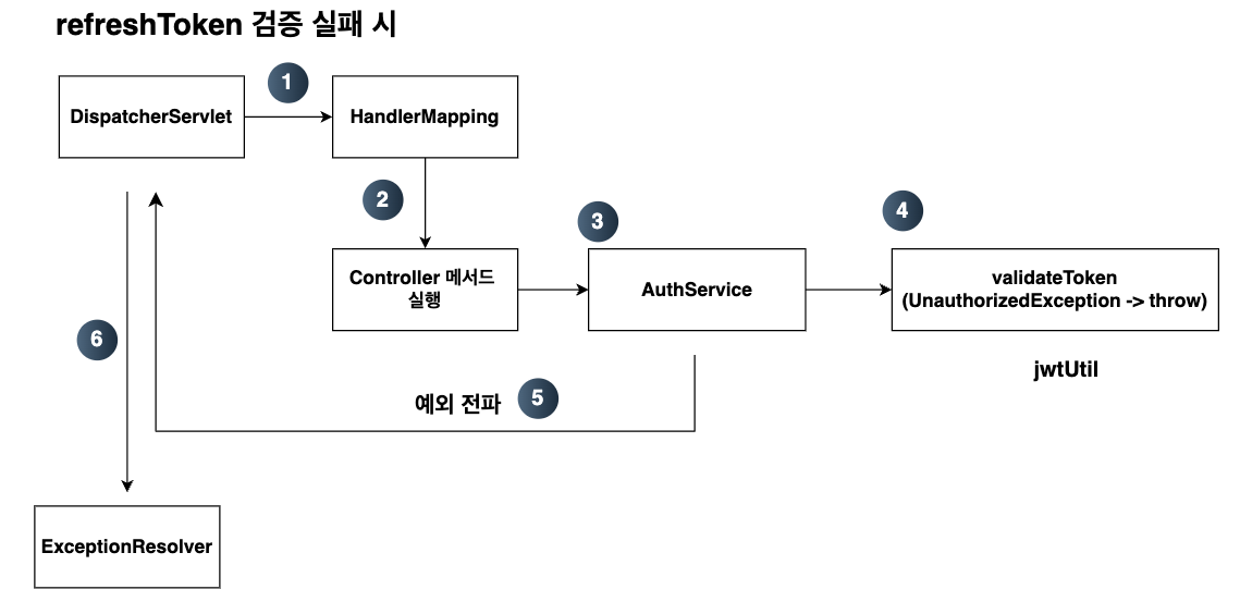 - 필터 체인 바깥의 @RestControllerAdvice까지 가면 좋겠지만, Security 필터는 DispatcherServlet 전에 있어서 전역 예외 핸들러까지 도달하지 못한다.