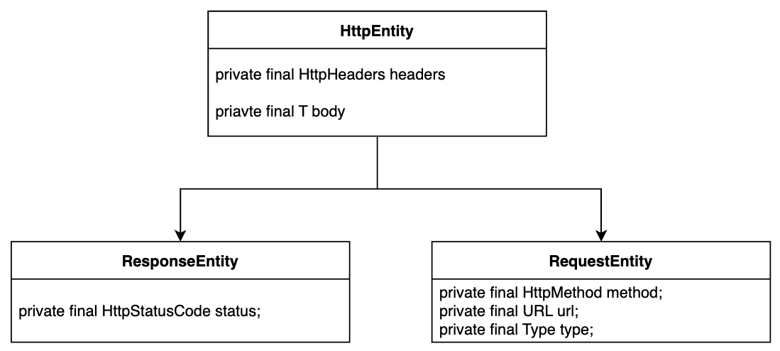 - 스프링 프레임워크 httpEntity라는 클래스가 있다. 헤더와 body로 구성된 http 요청과 응답을 구성하는 역할 수행