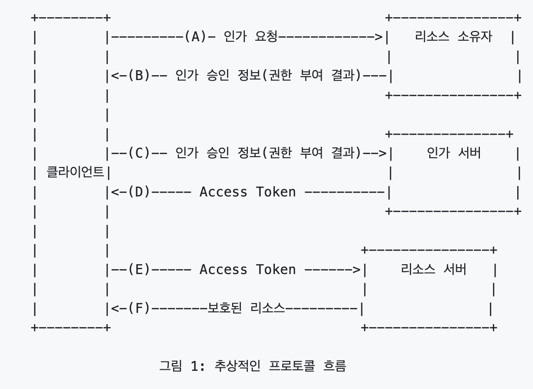 그림 1에 나타낸 추상적인 OAuth 2.0 흐름은 네 가지 역할 간의 상호 작용을 설명하며 다음과 같은 단계를 포함한다.