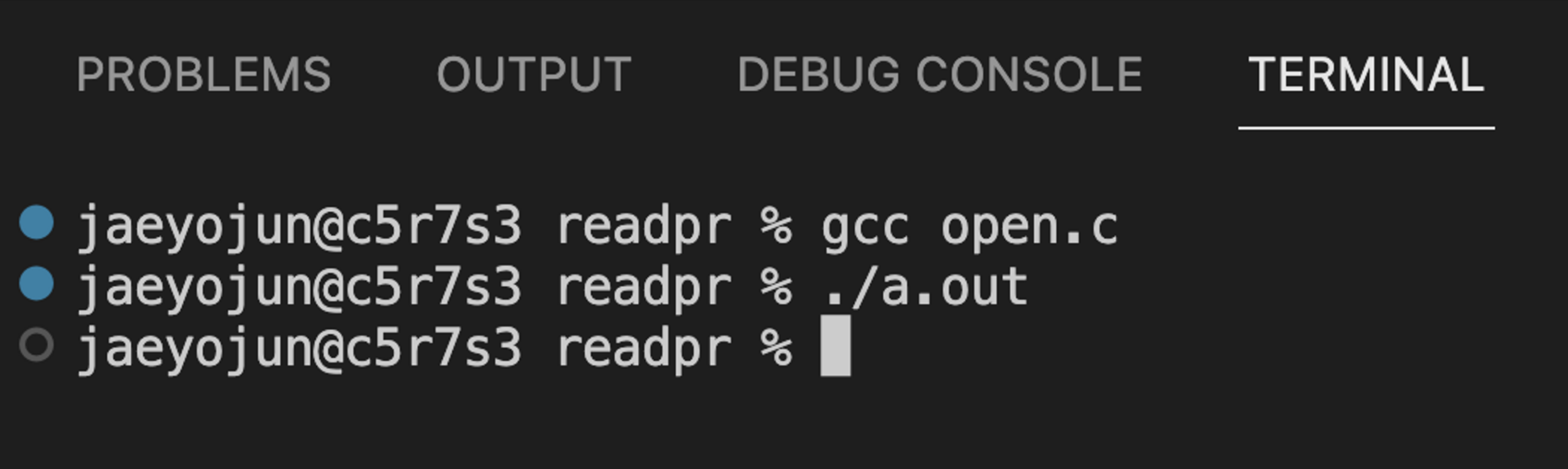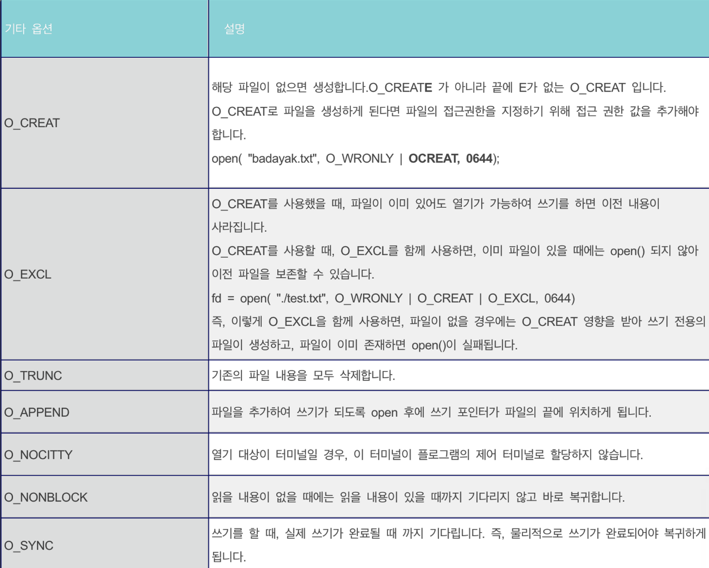- int 0 < 파일 열기에 성공하면 파일 디스크립터의 양의 정수 값 반환