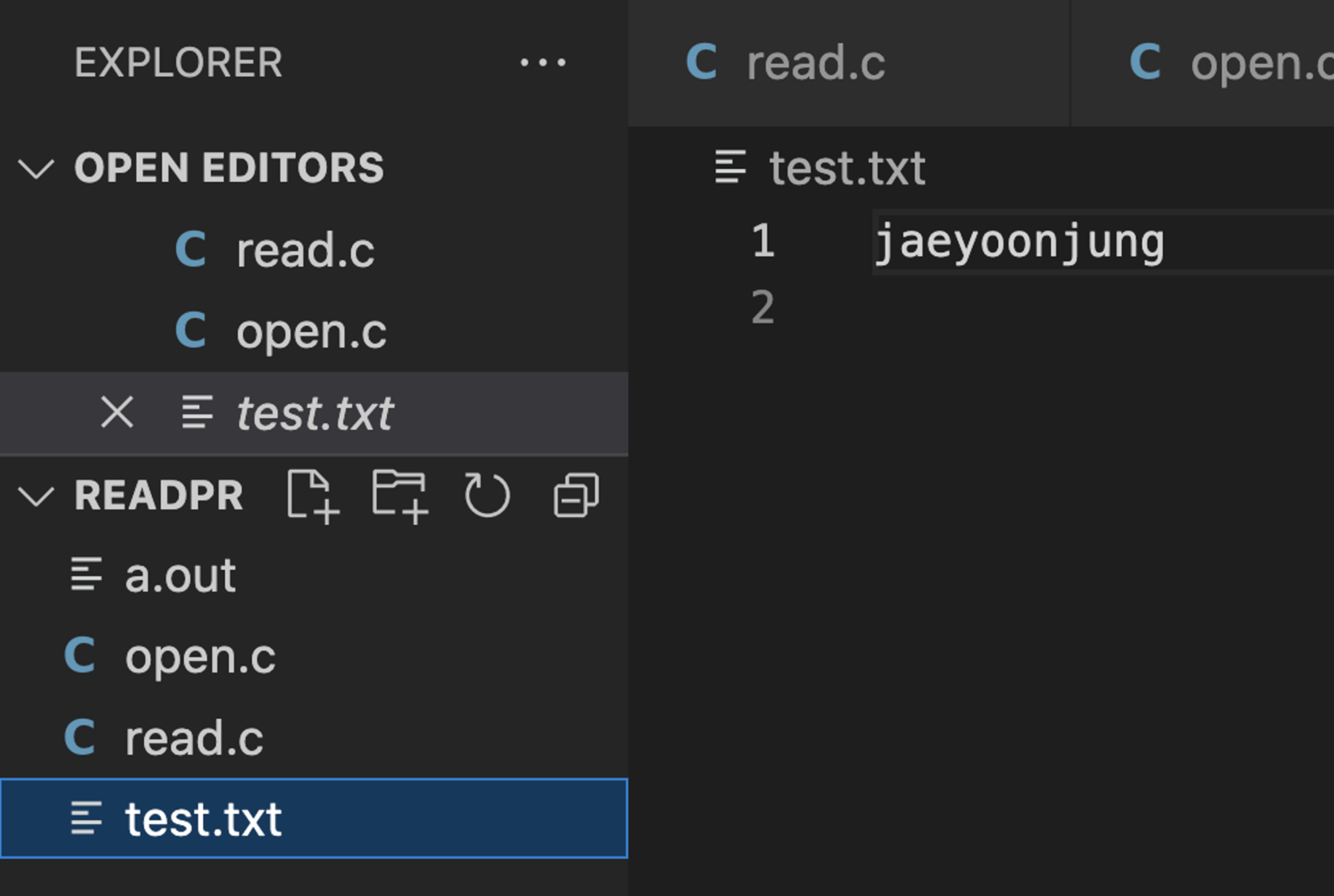 : text.txt라는 파일이 없으면 파일을 생성하고 파일에 "jaeyoonjung\n"을 쓰기함.
