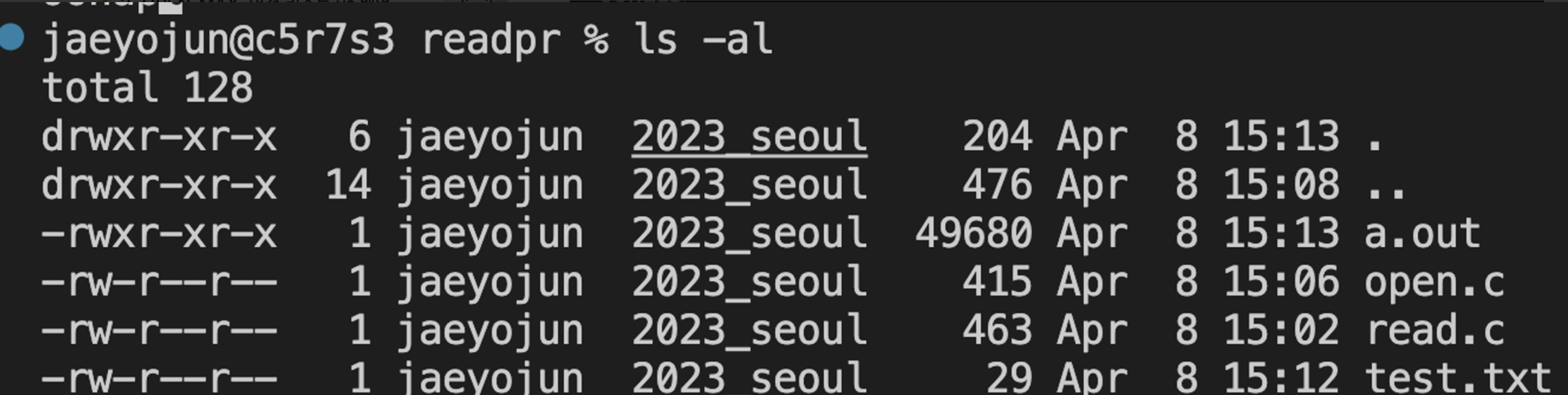 - [, mode_t MODE] O_CREAT 옵션 사용에 의해 파일이 생성될 때 지정되는 파일 접근 권한