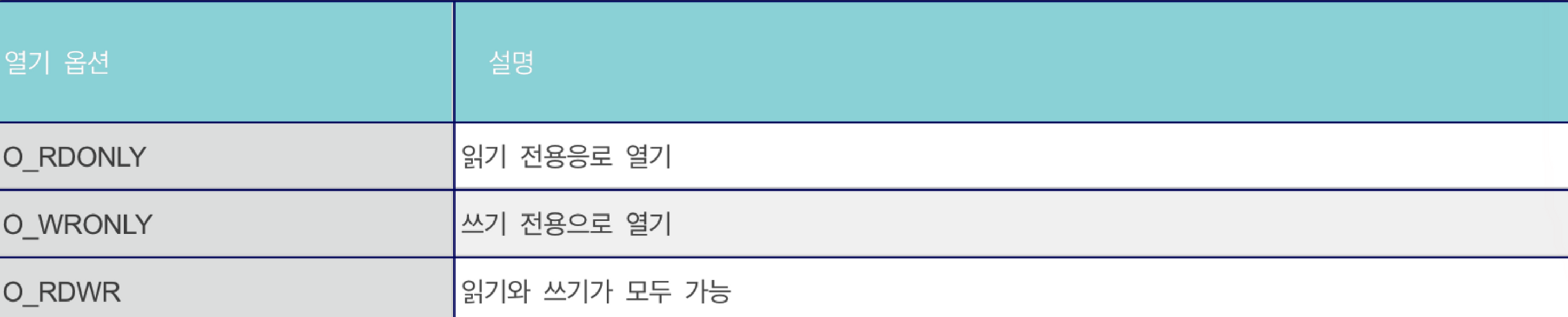 파일을 open할 때는 용도에 따라 읽기 전용, 쓰기 전용 또는 읽기와 쓰기 모두 되는 옵션을 지정하여 열기 가능 모두 <fcntl.h>에 정의되어 있음.