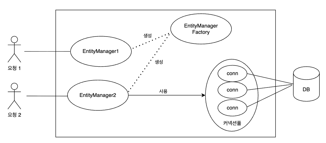 EntityManagerFactory 생성 → 커넥션 풀 생성 → DB 커넥션 여러 개 미리 확보