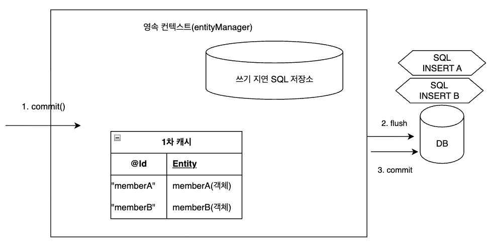 - 데이터를 저장하면 등록 쿼리를 메모리아 모아놓고 트랜잭션 커밋할 때 쿼리를 DB에 보낸 후 커밋