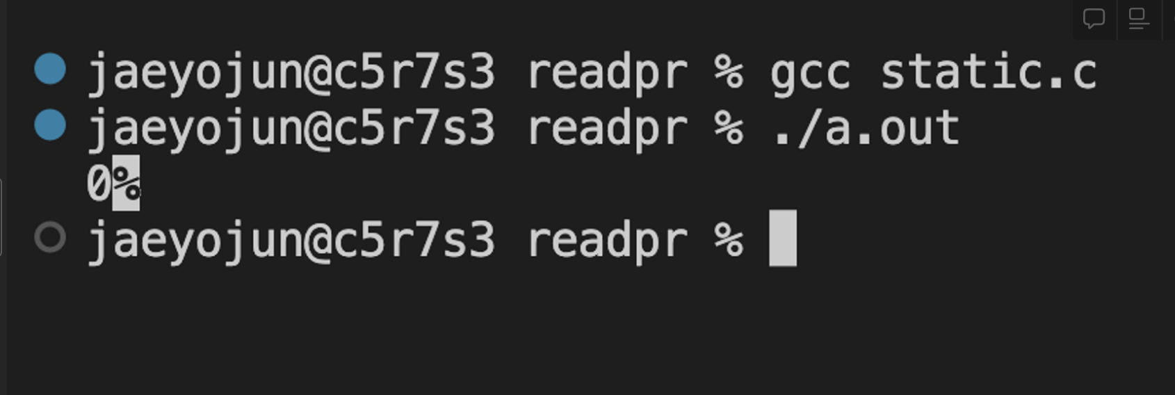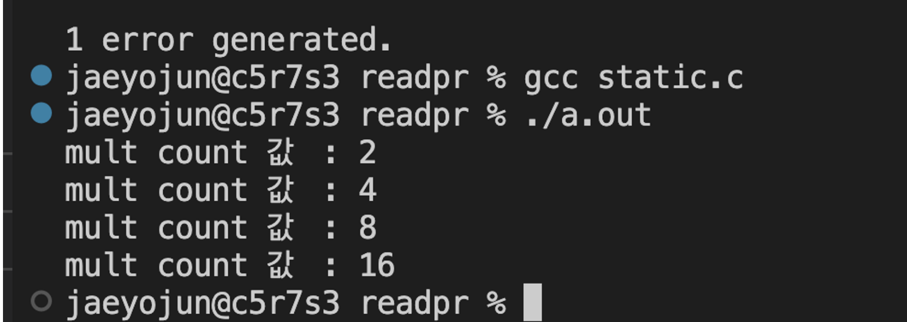 mult에서 선언한 static 변수는 파괴되지 않고 값을 계속 가질 수 있다는 것을 알 수 있었다.
