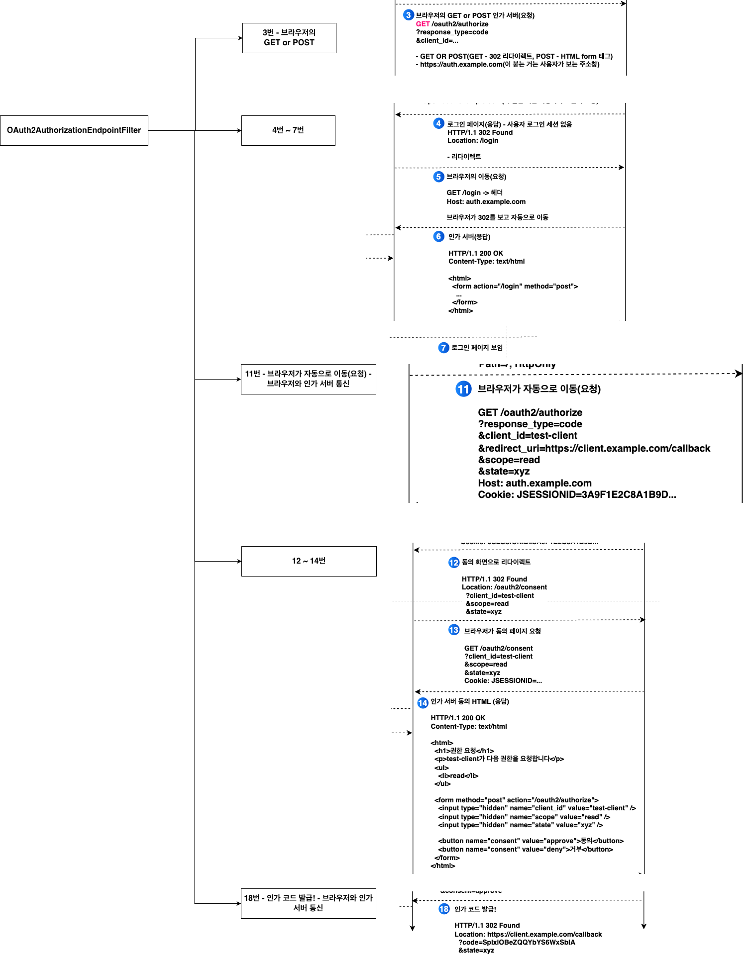 11번 - 브라우저가 자동으로 이동(요청) - 브라우저와 인가 서버 통신