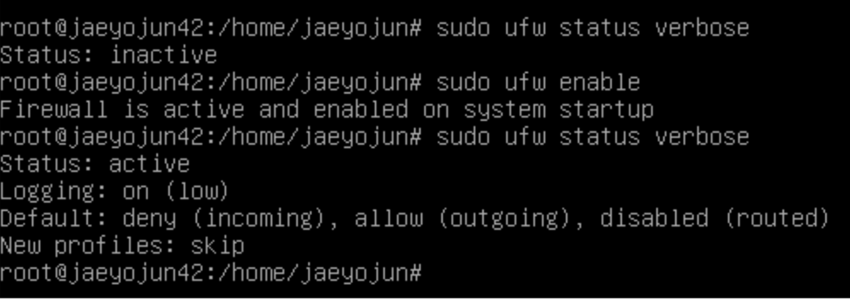 $ sudo ufw default deny # 기본으로 들어오는 패킷 거부(deny)로 설정