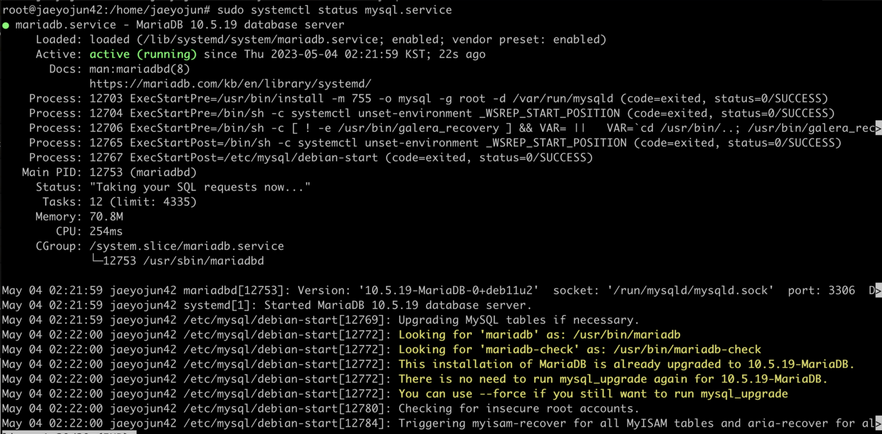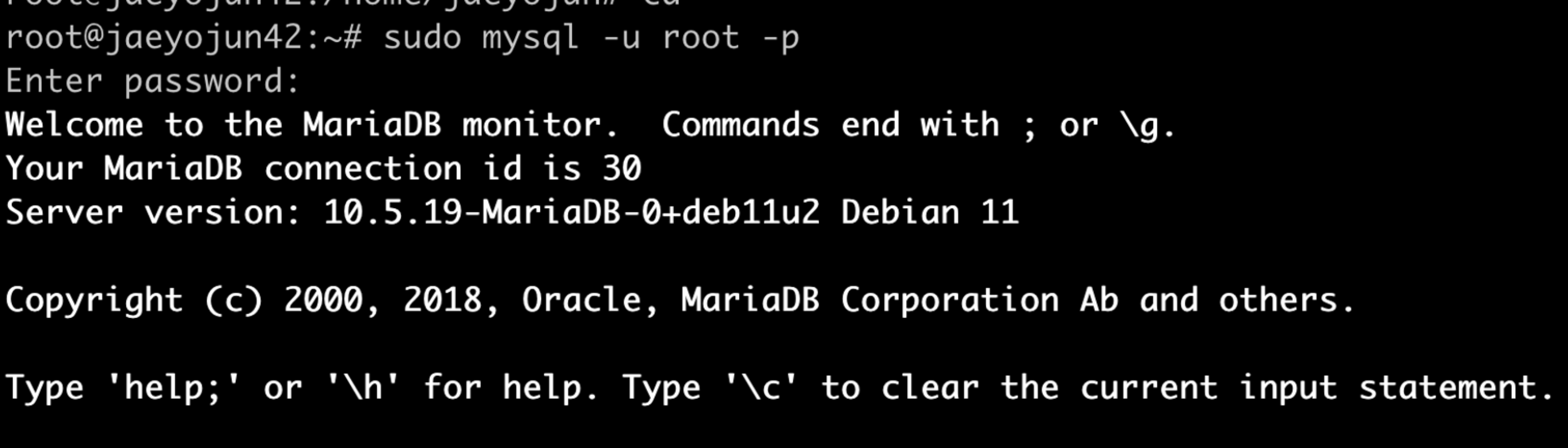 진입한 뒤 SQL 문법으로 DB 생성과 계정 만들고, 권한 부여