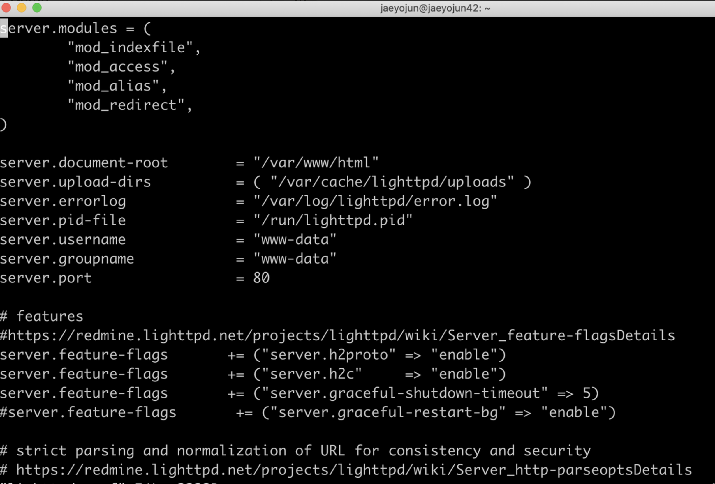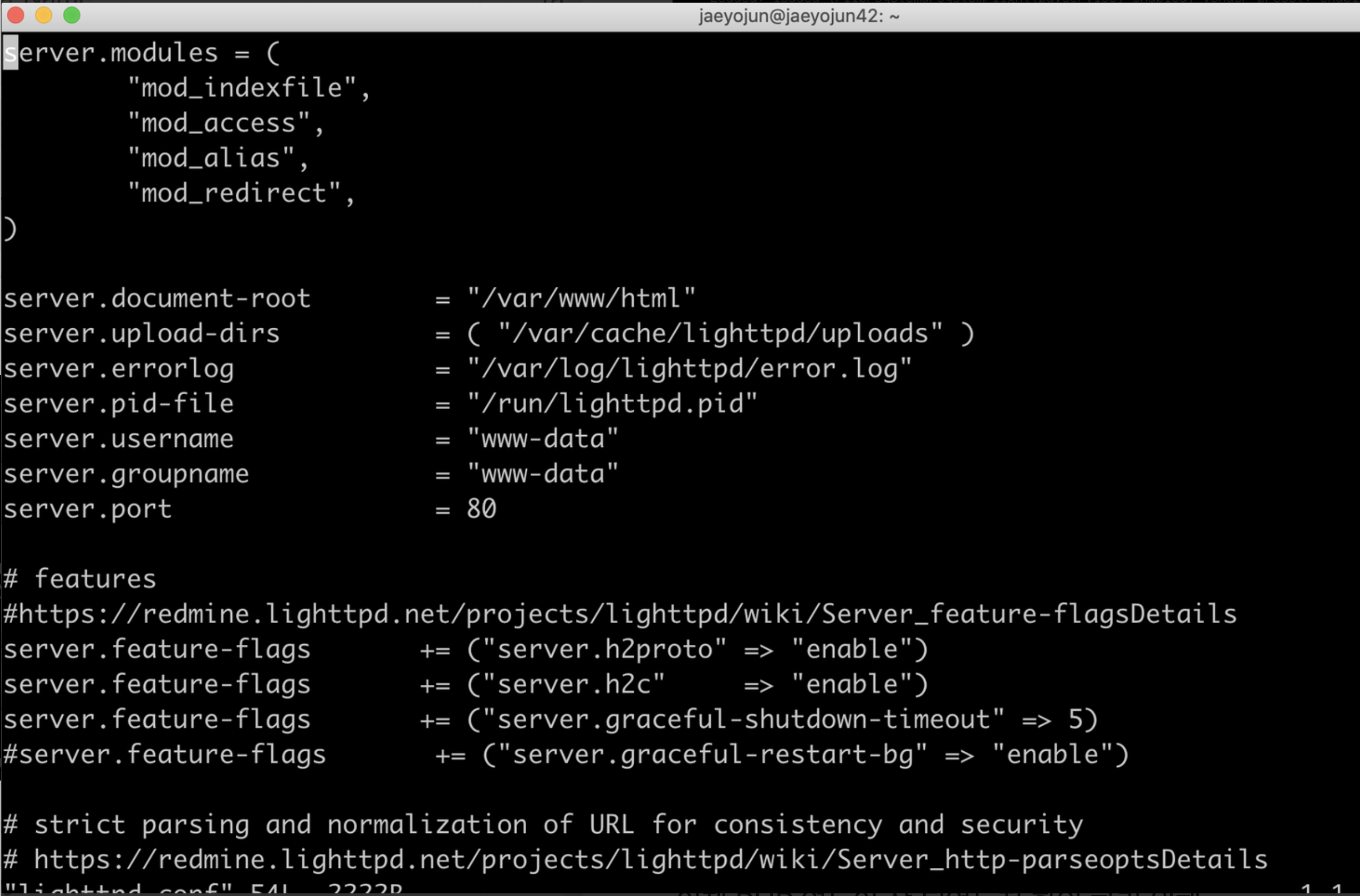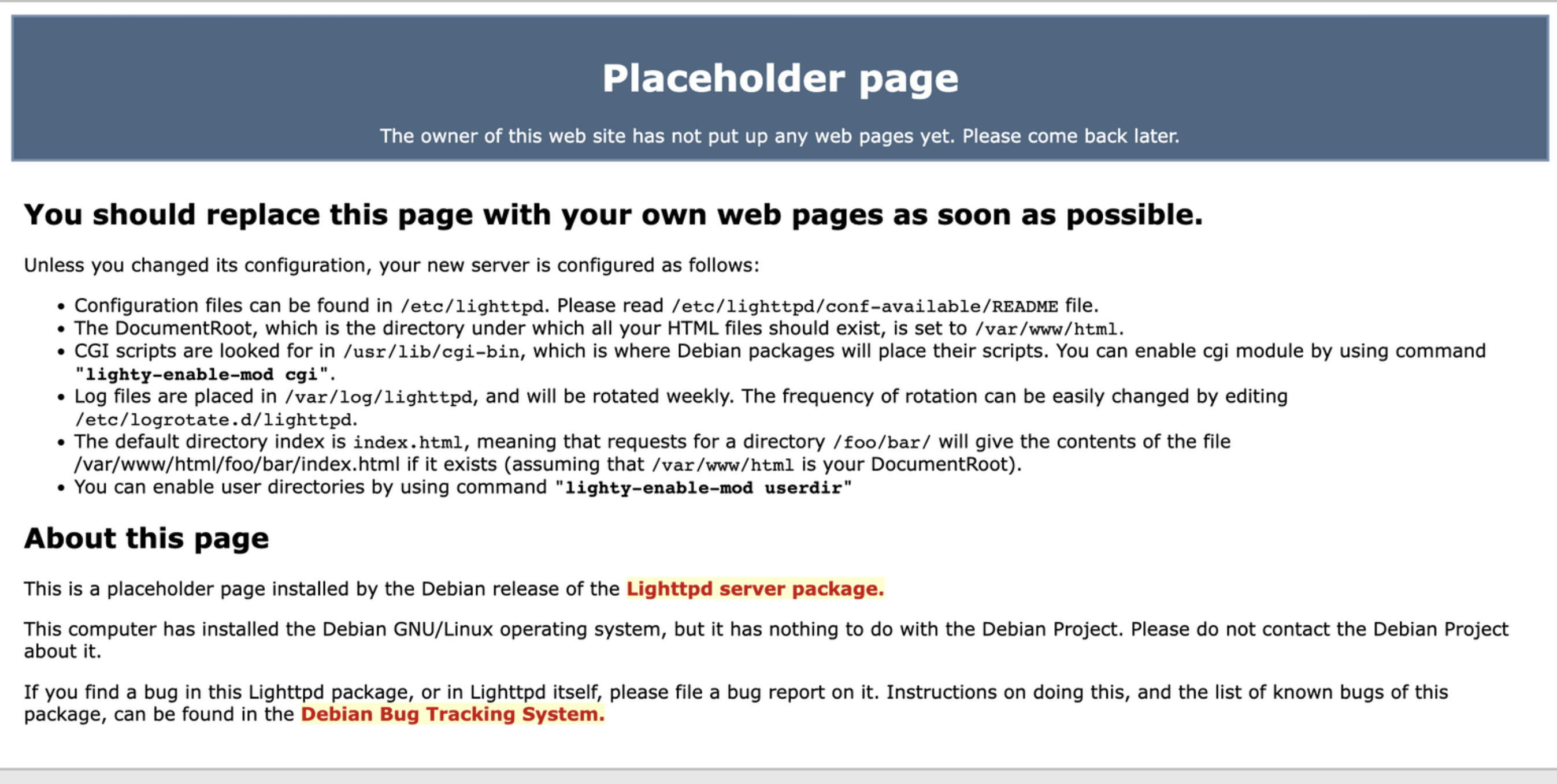 정상적으로 연결이 됨을 확인할 수 있다. 표시되는 페이지는, 위 lighttpd.conf 파일의 server.document-root 에 해당하는 디렉토리, /var/www/html/ 의 index.lighttpd.html 파일이다!