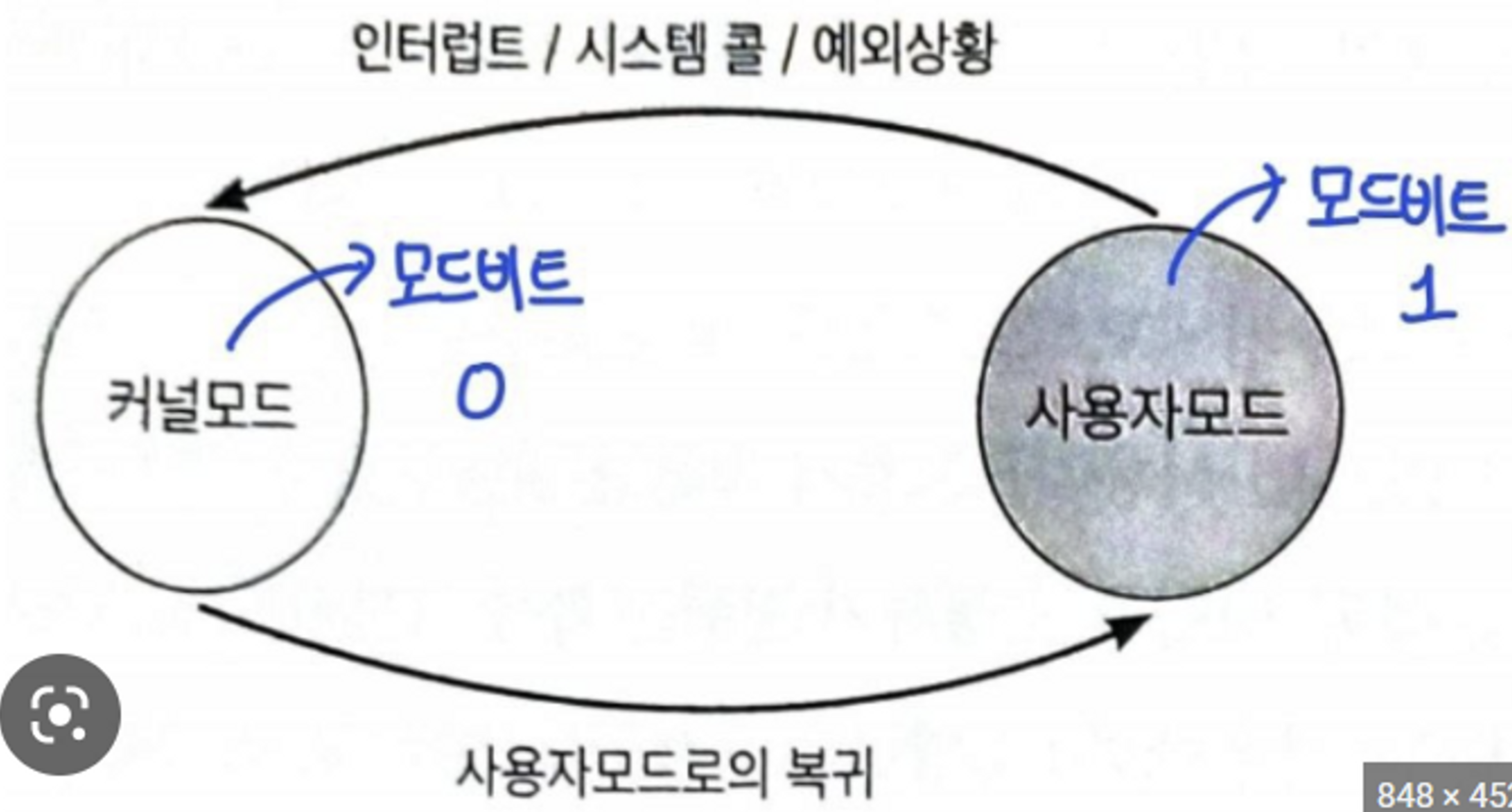 보안이 필요한 중요한 명령을 수행해야 할 경우 → 시스템 콜을 통해 운영체제가 대신해줄 것 요청 → CPU 제어권 다시 운영체제한테 감. → 인터럽트 발생할 떼 모드비트는 자동으로 0 세팅 → 작업 끝 → 모드비트 다시 1로 세팅 → 사용자 프로그램에게 CPU 넘겨줌