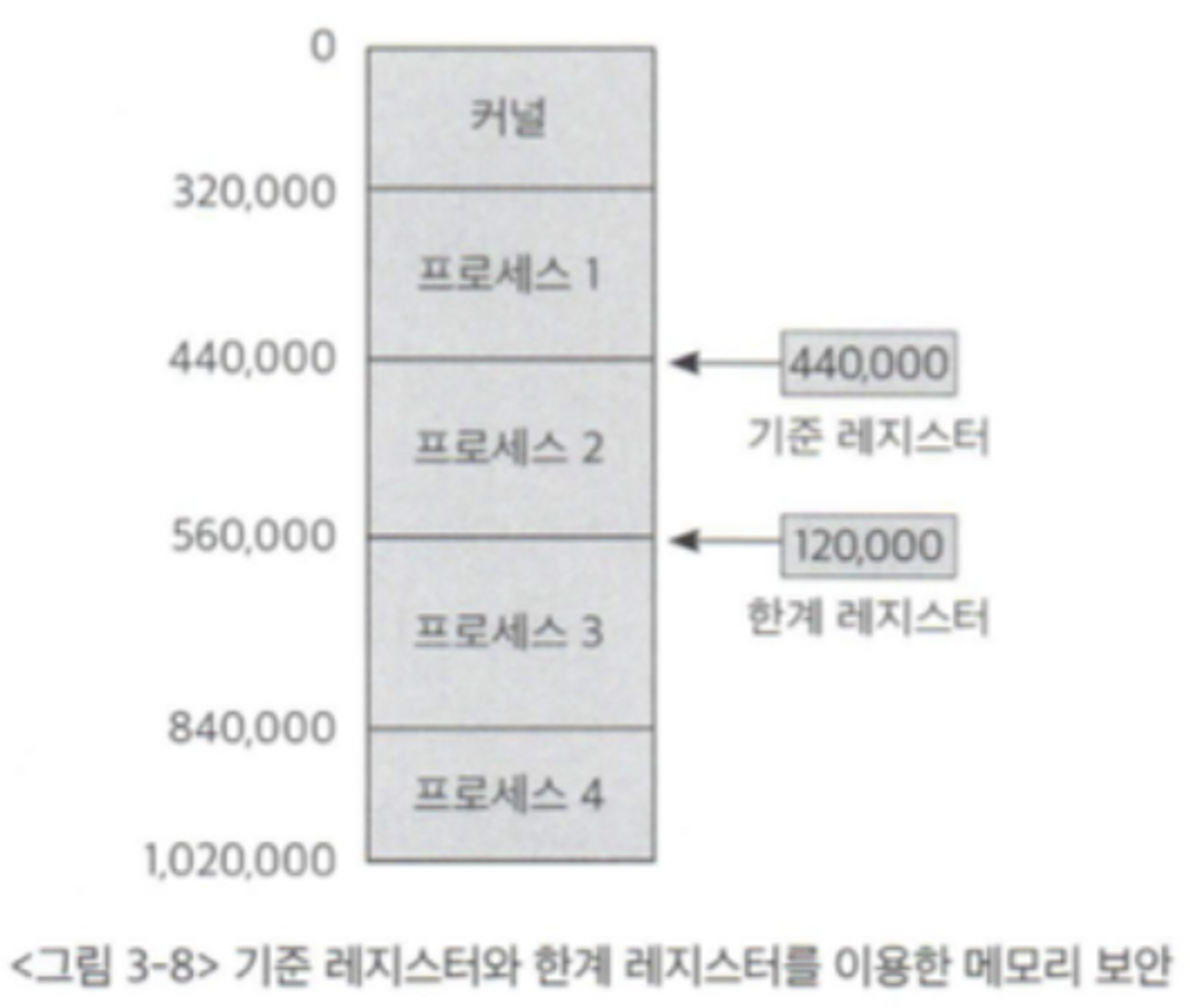 → 기준 레지스터와 한계 레지스터 사용하여 메모리 보호
