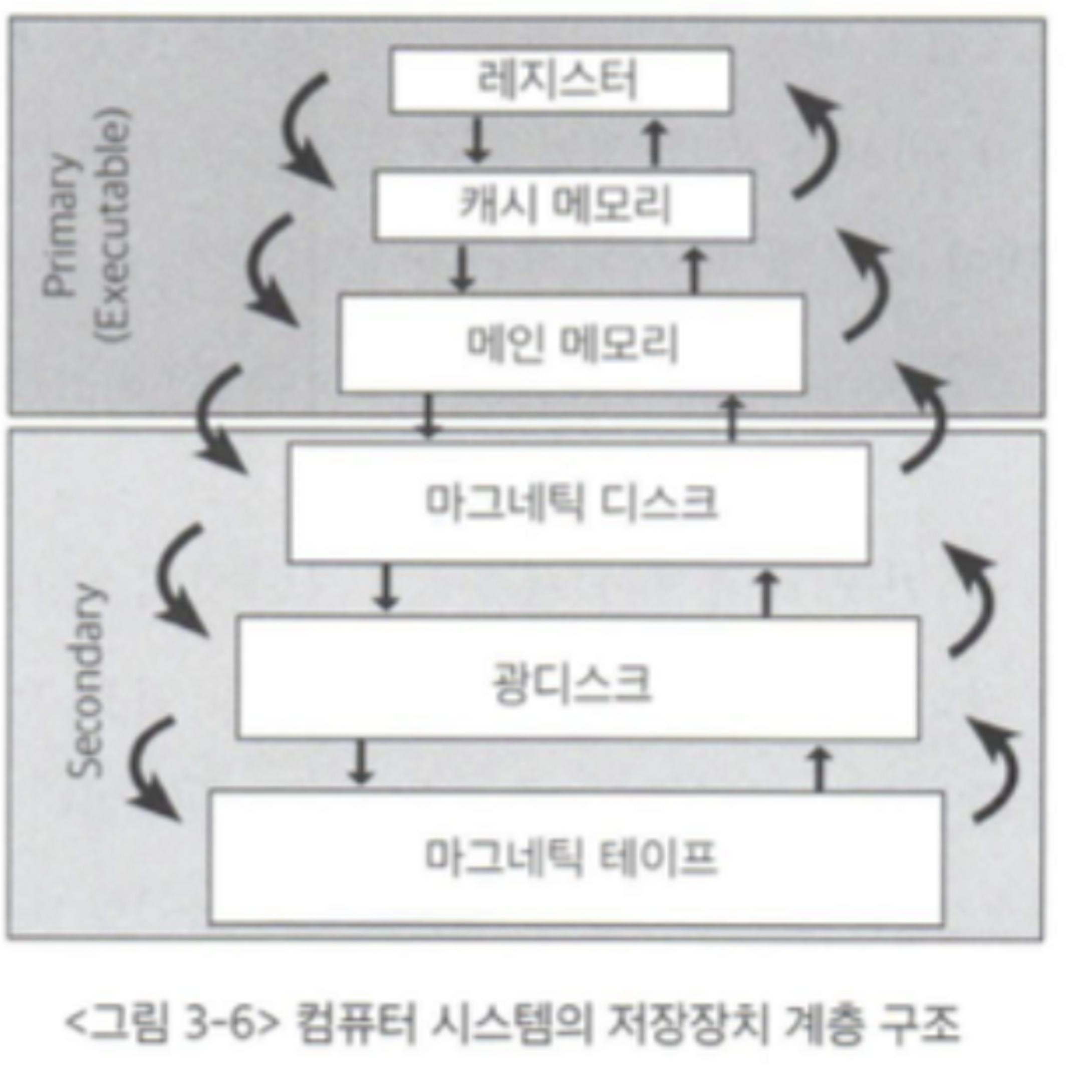 → 캐싱 기법을 컴퓨터 시스템 내의 다양한 저장장치 계층에서 활용함으로써 적은 용량의 상위 저장장치만으로도 대부분의 경우 빠른 수행 속도의 성능을 얻어낼 수 있다.