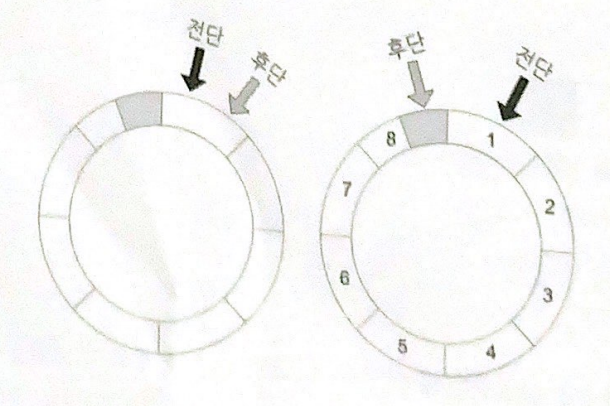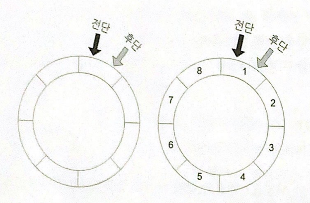 이 문제를 해결하기 위해서 일반적인 해법은 큐 배열을 생성할 때 실제의 용량보다 1만큼 더 크게 만들어서 전단과 후단(실제 후단) 사이를 비우는 것이다. 이렇게 하면 큐가 비어 있을 때 전ㄷ나과 후단이 같은 곳을 가리키게 되고, 큐가 차 있을 때는 후단이 전단 보다 1 작은 값을 갖게 된다.
