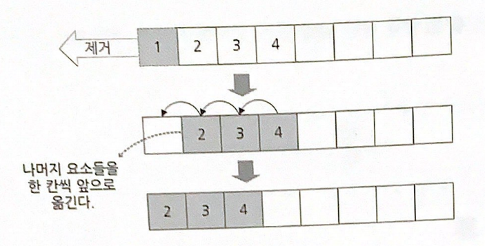 이 그림의 큐 배열의 크기는 8이며 그 안에는 1, 2, 3, 4의 값을 가진 요소가 있다. 전단인 1을 제거하면 배열 내에 첫 번째 인덱스의 요소는 비게 되고, 빈 자리를 채우기 위해 뒤에 있던 2, 3, 4 요소가 앞으로 한 칸씩 옮겨온다.