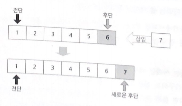 전단을 가리키는 변수를 도입해서, 배열 내의 요소를 옮기는 대신 변경된 전단의 위치만 관리하는 것이다. 이와 함께, 후단을 가리키는 변수도 도입해서 삽입이 일어날 때마다 변경되는 후단의 위치를 관리한다. 후단을 가리키는 변수에 실제 후단의 위치보다 1을 더한 값을 가진다.