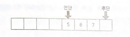 그림에서 큐는 초기 용량이 8개 였지만, 제거 연산을 4차례 수행해서 용량이 반밖에 남지 않았다. 게다가 후단도 배열의 끝을 도달해 있다.