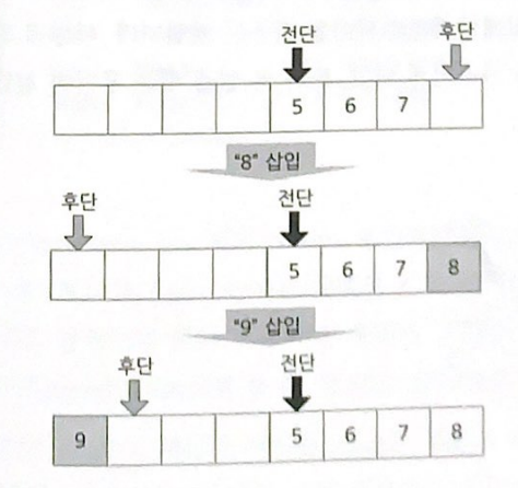 배열의 마지막 요소가 후단이었을 때 8을 삽입하면서 배열의 첫 번째 요소가 후단이 되었다. 여기에 또 9를 삽입하면서 두 번째 요소가 후단이 되었다. 삽입이 이루어질 때마다 후단이 뒤로 후퇴하다가 전단을 만나게 되면 그 큐는 비로소 '가득 찬 상태'가 된다. 이 경우에는 뭔가를 큐에 더 밀어 놓고 싶어도 할 수가 없게 되는 것이다.