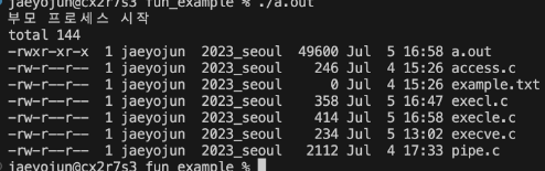 → 부모 프로세스에서 execv 함수를 사용하여 "ls -l" 명령어를 실행하는 예제.