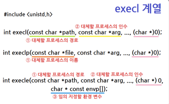 쉽게 말해서 exec() 함수는 execve가 틀인데 이 틀을 통해서 다른 친구들을 만들었다고 생각하면 됨. → excel, execvp … 전부