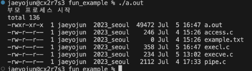 - 부모 프로세스 종료라는 것은 나오지 않음 execv 성공적으로 실행되면 아래의 코드는 실행되지 않는다!