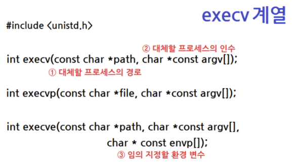 - unistd.h에 선언되어 있다. exec() 계열 함수를 호출하면 새 프로세스(외부 프로그램이)가 실행되고 해당 프로세스는 종료된다.