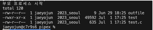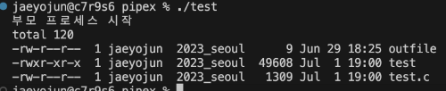 - 처음에는 "부모 프로세스 시작"이라는 출력을 확인. 그런 다음 execv() 함수를 사용하여 "/bin/ls" 프로그램을 실행하고, "ls"와 "-l"을 명령행 인수로 전달. 실행 결과로 현재 디렉토리의 파일 및 폴더 목록이 출력.