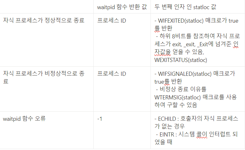 | pid가 0일 경우 (pid == 0) | waitpid를 호출한 프로세스의 프로세스 그룹 PID와 같은 프로세스 그룹 ID를 가진 프로세스를 기다림 |