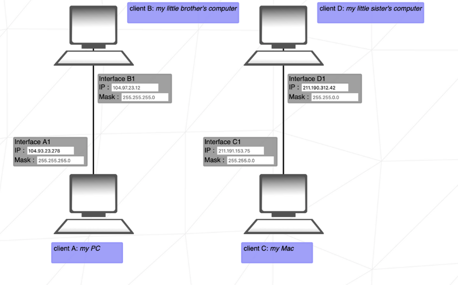 클라이언트 H2와 H11 맞추기 R13, R21, R22, H31 마스크 맞추고 IP 맞추기 R23과 H41 맞추기 라우터 R1 맞추기 인터넷 목적지 대역 IP주소 맞추기 클라이언트 H2와 H11 맞추기 R11 마스크로 통일한다. H21의 IP주소를 알맞게 맞춘다. R13, R21, R22, H31 마스크 맞추고 IP 맞추기 R21를 보면 고정 마스크가 있음. 이것들 다 맞춰준다. 그러면 이제 R22와 H31이 남을 텐데 R21에서 고정 IP와 마스크넷 And 연산을 하게 되면 호스트 범위가 나오는데 남는 부분을 R22와 H31에 넣어준다. 클라이언트 H3 라우팅 테이블 수정 R23과 H41 맞추기 H41의 고정 마스크를 맞춰준다. 클라이언트 H4 라우터를 가는 방향을 보면 R23의 IP주소를 알 수가 ..